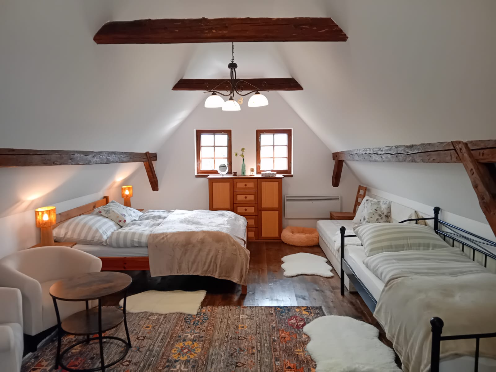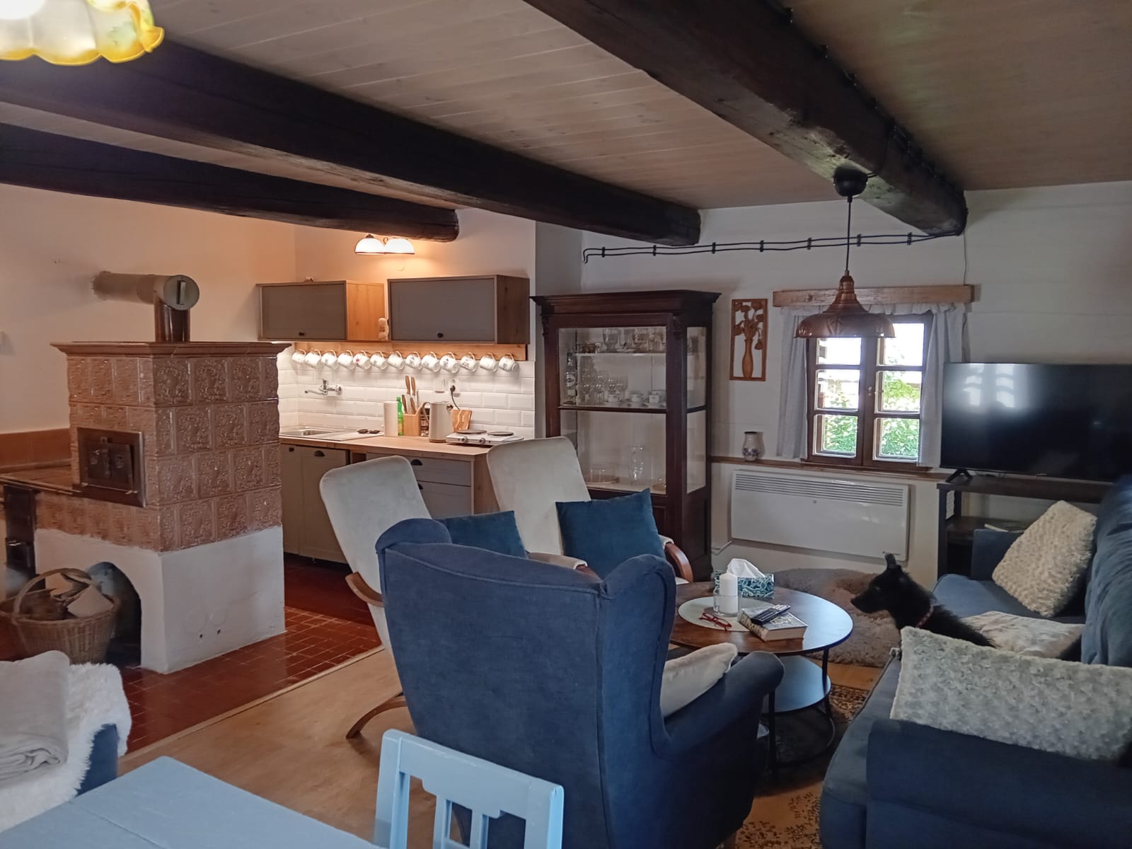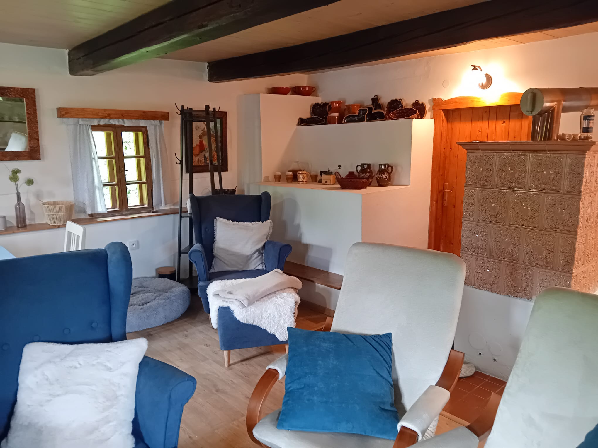 A pokud by vám počasí nepřálo, stačí zatopit v kachlových kamnech a zahrát si karty, nějakou z deskových her nebo si jen v křesle číst knížku, místa pro všechny odpočinkové aktivity je v chaloupce dost.