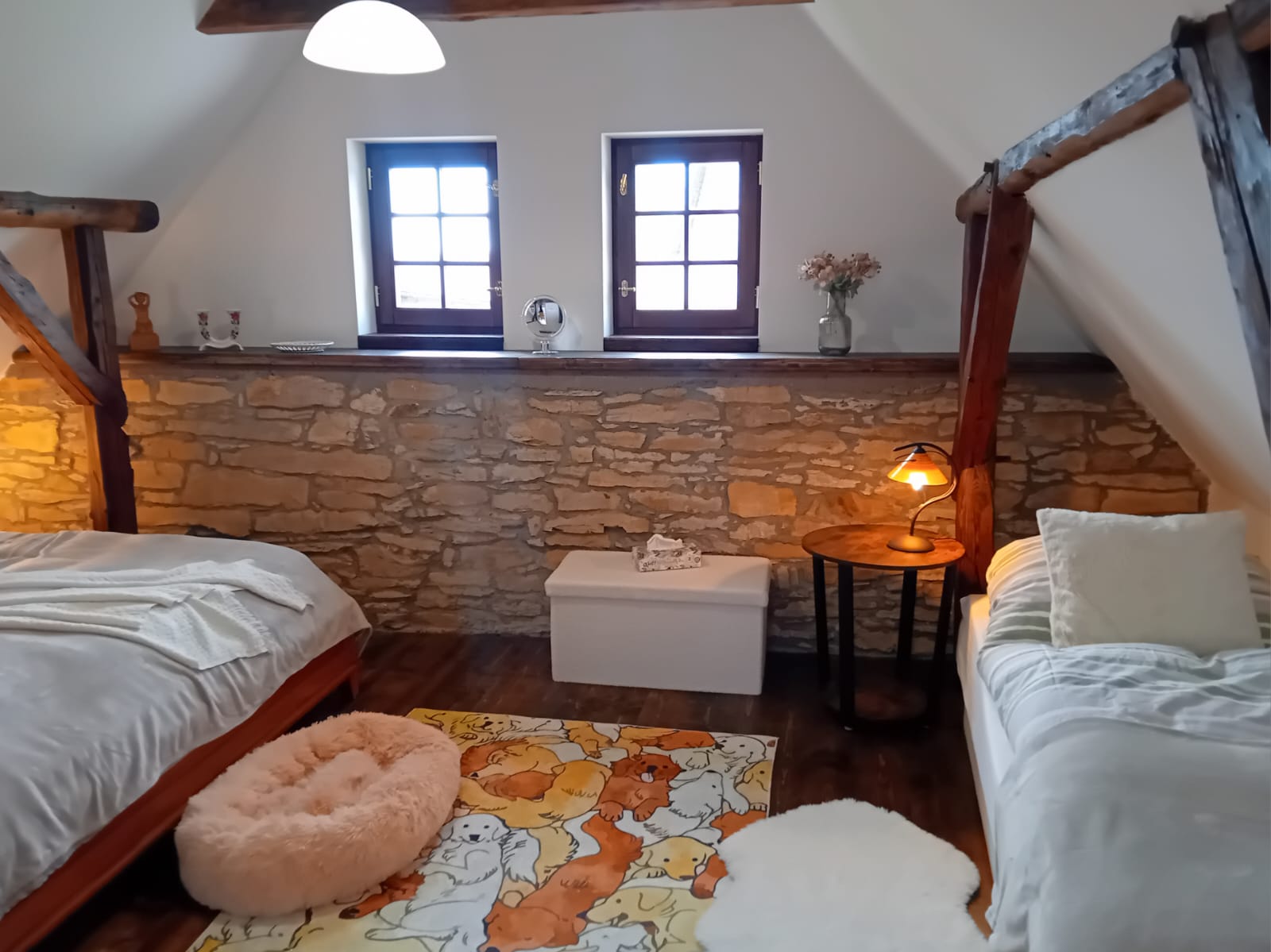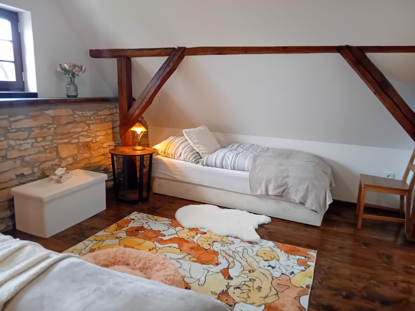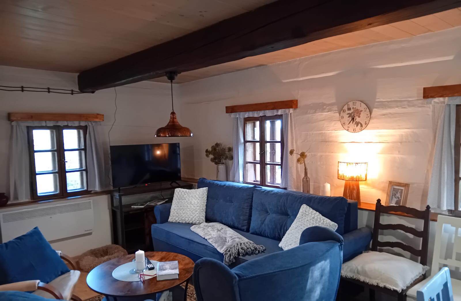 A pokud by vám počasí nepřálo, stačí zatopit v kachlových kamnech a zahrát si karty, nějakou z deskových her nebo si jen v křesle číst knížku, místa pro všechny odpočinkové aktivity je v chaloupce dost.